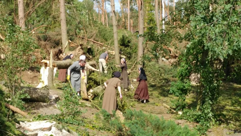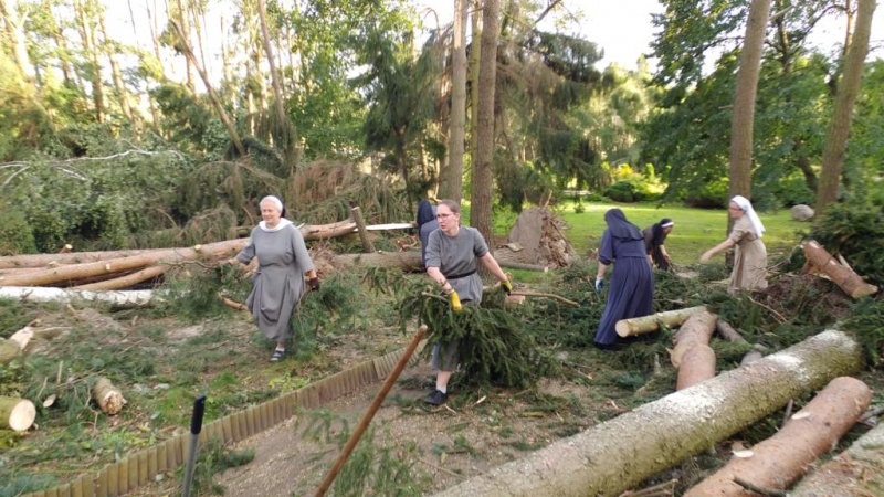 Nawałnica, która nawiedziła Kaszuby dotknęła również nasz klasztor Sióstr Franciszkanek w Orliku. Została zniszczona ogromna powierzchnia lasu, cały park łącznie z cmentarzem. Zostały naruszone również ogrodzenia klasztorne. Dziękujemy Bogu za ocalone budynki, krzyże, Drogę Krzyżową, figury, nawet te, które zostały przygniecione ogromnymi drzewami. Pośród tej tragedii to są znaki nadziei. Potrzeba jeszcze dużo pracy do oczyszczenia parku i całego otoczenia. Cieszymy się z każdej pomocnej dłoni, już dziś dziękujemy naszym rodzinom, przyjaciołom, parafiom, jednostkom OSP, które pospieszyły nam pomocą. Prace będą trwały jeszcze długo, gdyż teren jest ogromny. Słowa ogromnej wdzięczności kierujemy do mieszkańców Dziemian, Kamienicy Królewskiej, Wygody, Stężycy, Chojnic, Czerska, Gdańska, Rumi, Łubiany i wiele innych. Bez waszej pomocy nie byłoby możliwe nawet wejście do parku. Może kiedyś zawitają do niego ponownie ptaki i zwierzęta.