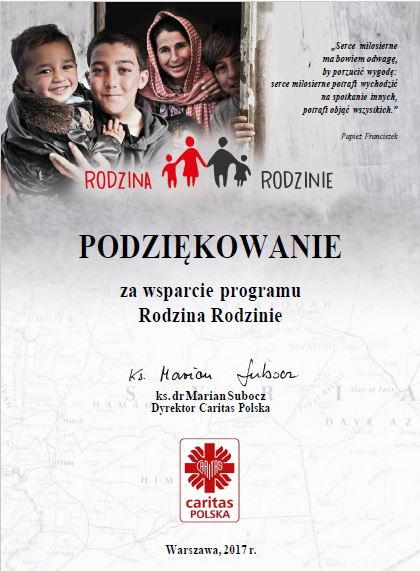 W imieniu Caritas Polska oraz rodzin, które otrzymały wsparcie w projekcie Rodzina Rodzinie serdecznie dziękujemy za półroczne zaangażowanie i pomoc kierowaną do wybranej rodziny z Syrii.