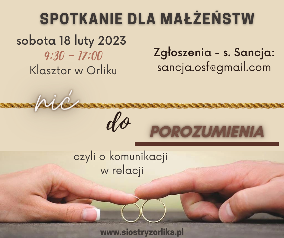 Małżeństwa z parafii Leśno i okolicy Orlika (bliższej lub dalszej...) bardzo serdecznie zapraszamy na pierwsze spotkanie dla małżeństw w Orliku, które odbędzie się 18 lutego. Spotkanie potrwa od rana do popołudnia, dlatego warto już teraz zarezerwować ten czas dla siebie i zgłosić swój udział do s. Sancji: sancja.osf@gmail.com. Ze względów organizacyjnych zapisy na wydarzenie potrwają do 5 lutego.